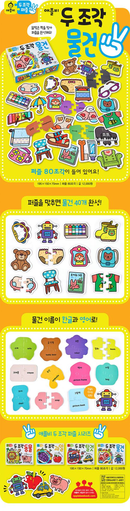 조카가 두 조각 퍼즐 탈것을 너무 재미있어 하길래 선물해 주려고 물건을 구입했습니다. 남자아이라 차 종류를 워낙좋아해서 탈 것은 신나서 맞추더니.. 물건은 아무래도 다소 처음 보는 물건들이 많아서 그런지 탈것만큼 흥미를 갖지는 않더라구요..ㅠㅠ 과일 살까 물건 살까 고민하다가 물건을 구입했는데 좀 더 크면 꺼내줘야겠어요. 퍼즐 자체는 너무 재미있어해서 다른 시리즈인 과일이랑 동물로 다시 구입해서 선물해줄 생각입니다! ㅎㅎ